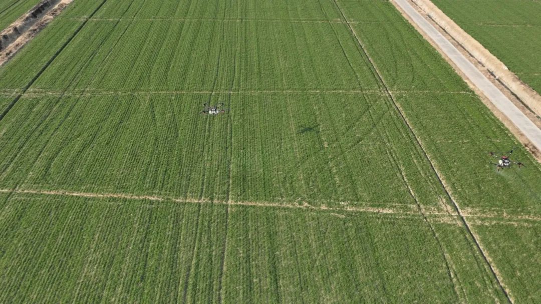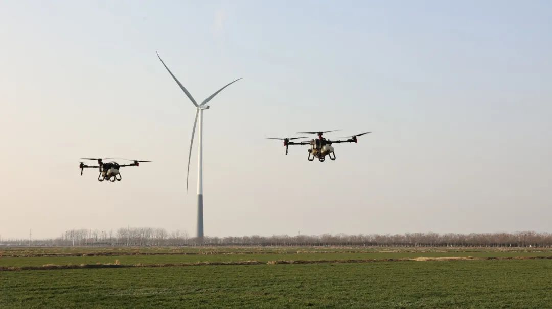 2月28日,在安徽农垦龙亢农场农业二场4号地块,两架无人机正在进行小麦雨前追肥作业。今年该场2.2万亩小麦全部实行无人机施肥。